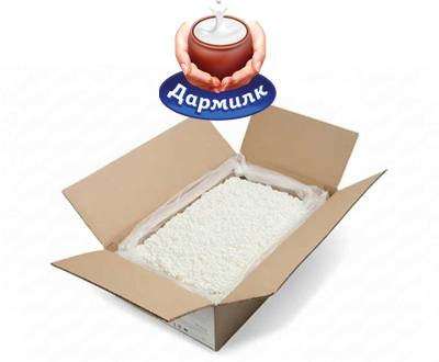 Дармилк работает в Липецкой области, сырьё берут у проверенных хозяйств. Творог в коробе держится в морозилке при минус восемнадцати несколько месяцев, после разморозки не становится водянистым.