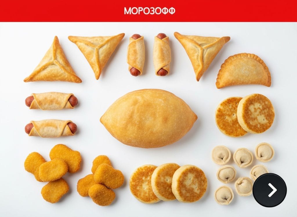 Морозофф известен премиальными полуфабрикатами: блины с начинкой, куры-гриль замороженные, зразы. Фокус на разнообразии начинок и удобстве порционной упаковки.